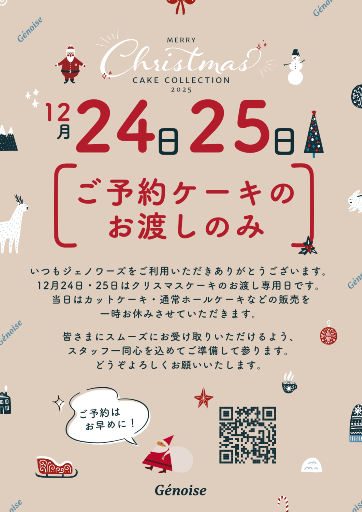 12月24日・25日の2日間は、全店ご予約頂いたクリスマスケーキの「お渡し専用日」とさせて頂きます。