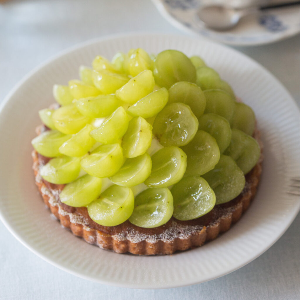 芳醇シャインマスカットの贅沢タルト。なめらかなクリームとサクっと香ばしいタルト生地が、フルーツの美味しさを引き立てます。